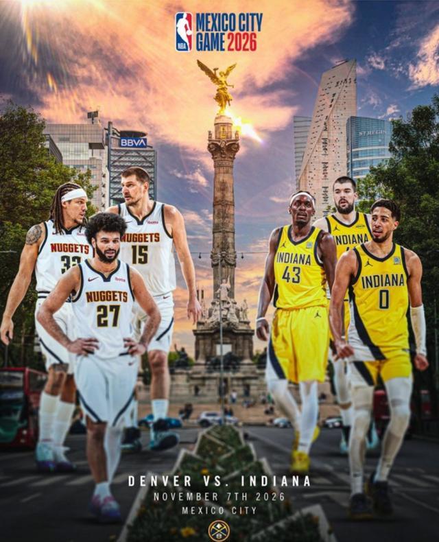 NBA墨西哥城比赛2026已确定。据名记Marc J. Spears透露,今年的墨西哥城赛的对阵双方,已确定将是掘金和步行者,时间确定是11月7日。