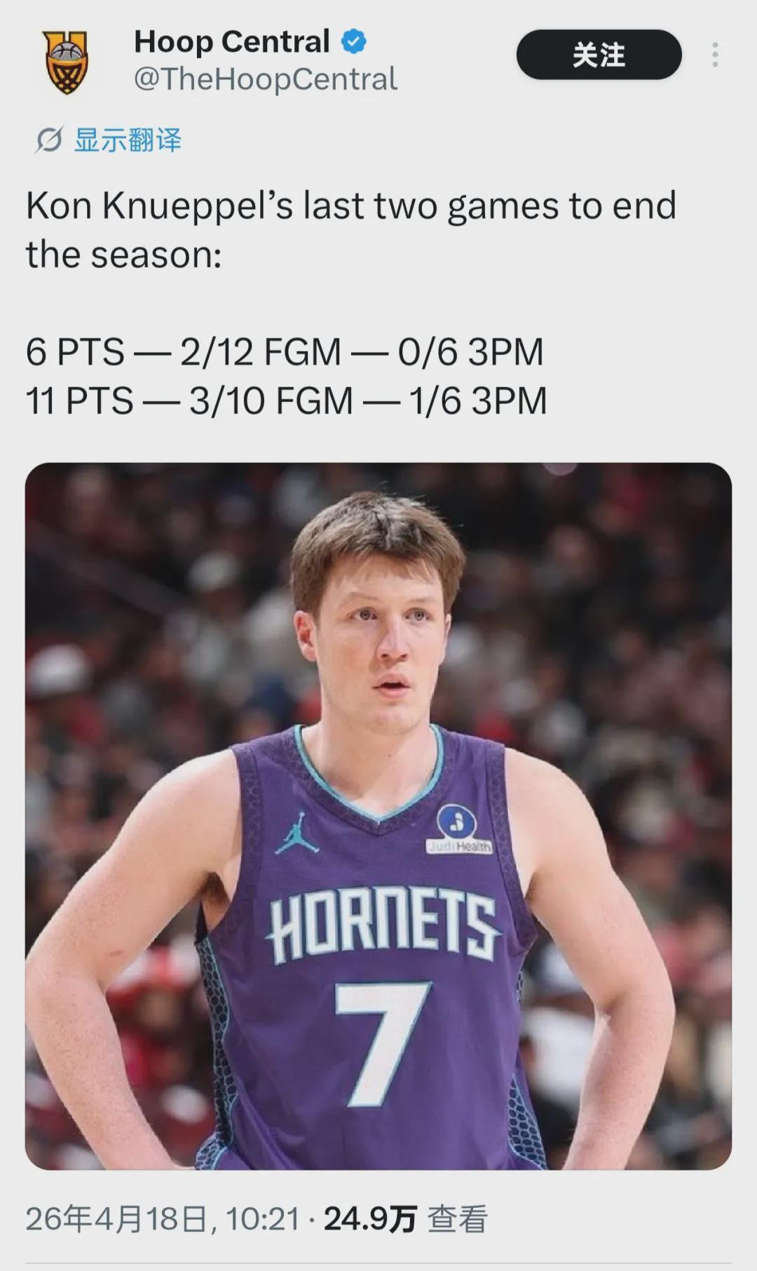 如果算上常规赛最后4场比赛,过去6场克尼佩尔场均10.8分4.5篮板2.7助攻,三分合计42中10,三分命中率只有23.8%。本赛季绝大部分时间,克尼佩尔发挥都非常稳定。万万没想到,常规赛收官阶段和附加赛,他突然外线失准了。