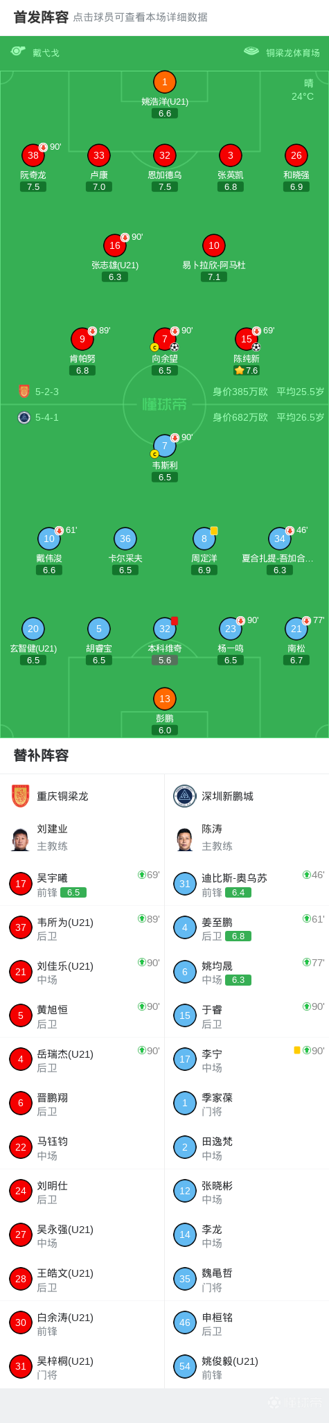 北京时间4月17日中国足球超级联赛第6轮,重庆铜梁龙主场对阵深圳新鹏城。陈纯新、向余望分别破门,本科维奇染红。最终比分重庆铜梁龙2-0深圳新鹏城。