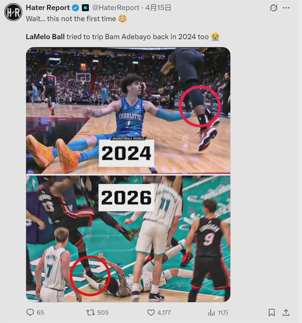 黄蜂和热火的附加赛,第二节刚开始,三球被封盖倒地之后,拉拽阿德巴约的脚部,导致后者受伤离场。最终黄蜂127-126,将热火淘汰出局。黄蜂将在4月18日上午7点半对阵魔术,争夺东部最后一个季后赛名额,三球届时能够出战。