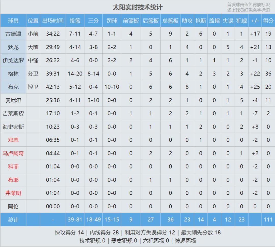 布克和场边的追梦对喷垃圾话,主裁判福斯特将两人驱逐。太阳111-96淘汰勇士,挺进季后赛,本赛季附加赛全部结束。杰伦-格林36分6板4助2断3帽、布克20分6板8助、古德温19分9板6断。两场附加赛,杰伦-格林一共轰下71分!