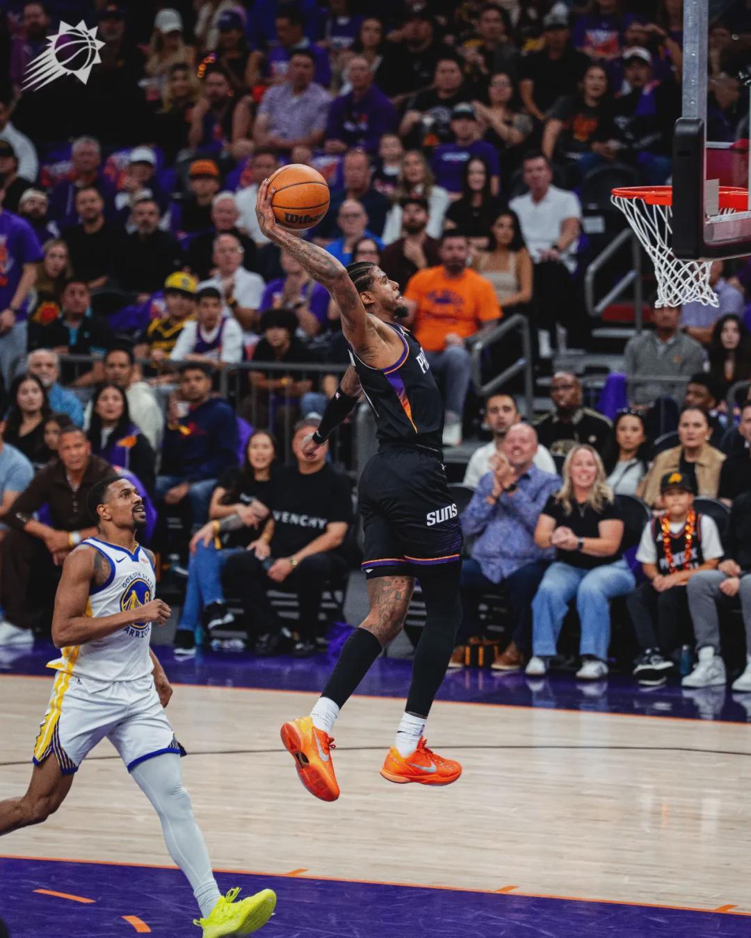 勇士的轮转防守总是慢一步,给了太阳不少空位三分的机会。第一节打完,太阳33-15领先勇士18分。勇士三分9中1,太阳三分15中6,失误数勇士8-4。第二节狄龙突然上头,连续单打不中,单节投篮5中0,破坏太阳的进攻节奏。