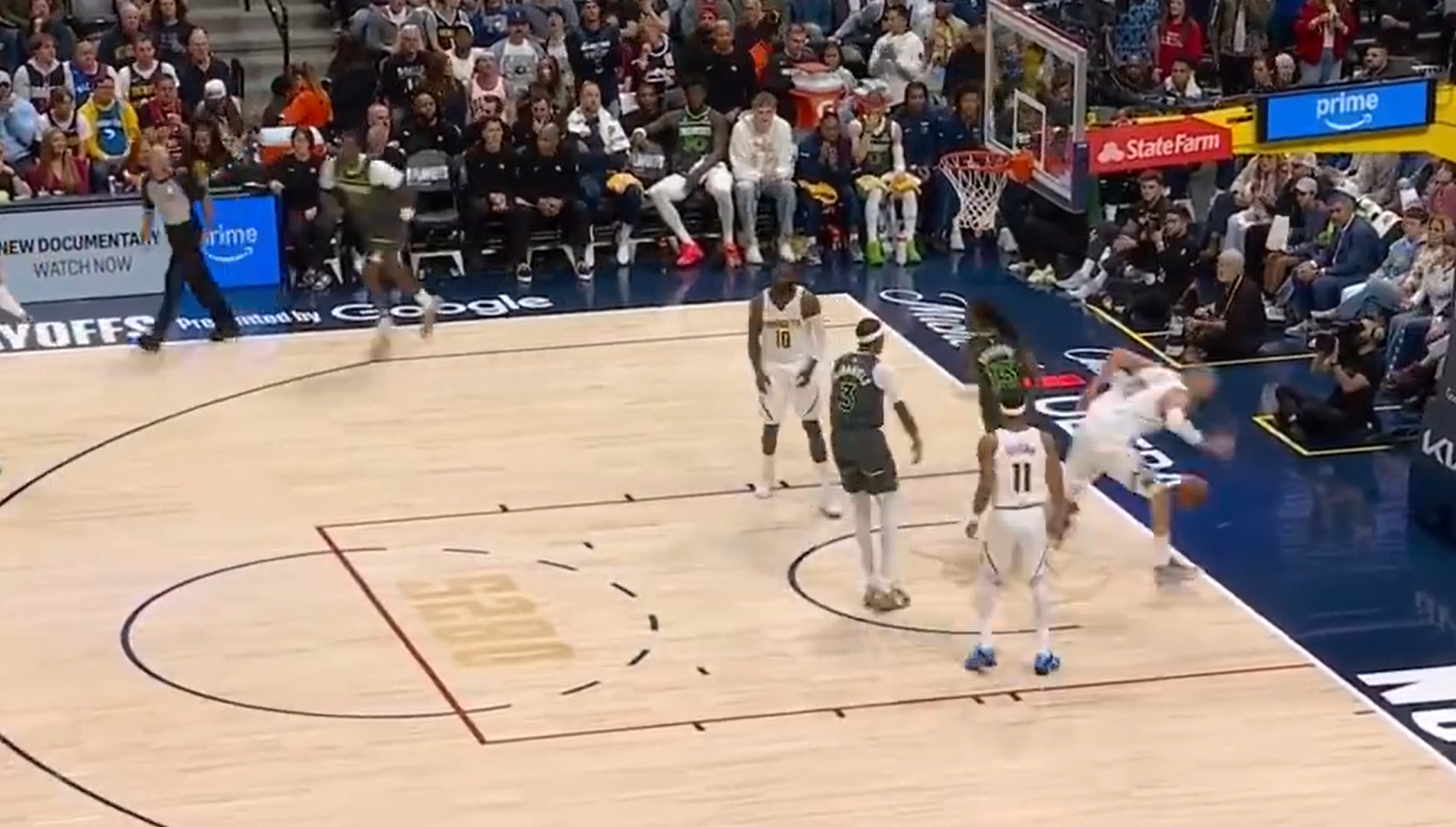 比赛打到第三节,掘金队已经以82比68领先森林狼队14分,此时森林狼队的球员有点心态失衡了,麦克丹尼尔斯在篮下出手没能命中,自己拼下篮板球之后补篮得手,万万没想到他居然还有个附加动作,从身后推了约基奇一把,把约基奇推出了底线。