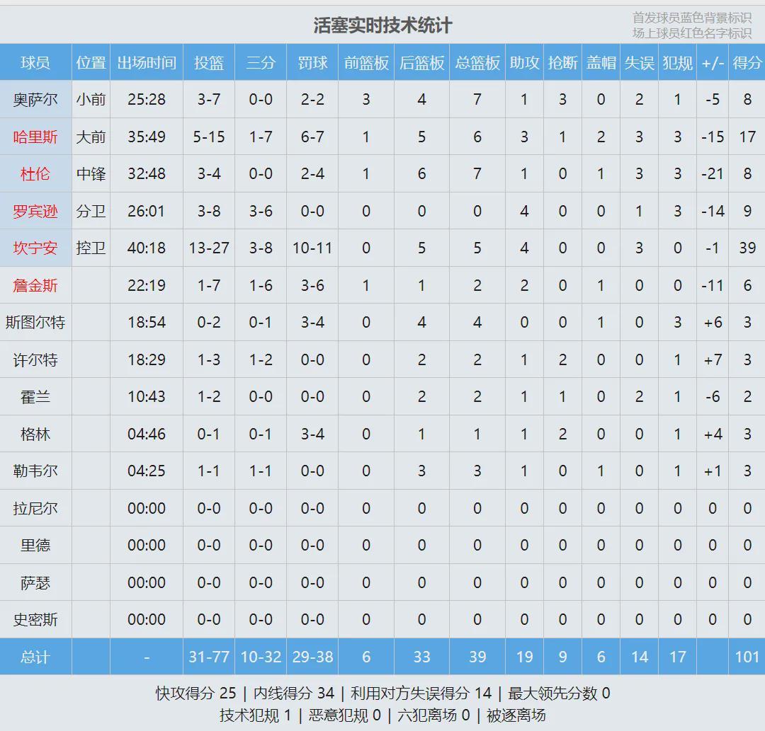 活塞首发:坎宁安、邓罗、哈里斯、奥萨尔-汤普森、杰伦-杜伦。常规赛收官阶段,坎宁安因为气胸连续缺席了11场比赛。复出后打了3场,三分球合计11中2。今天第一节开打之后,魔术多点开花,开局轰出18-5拉开到两位数。