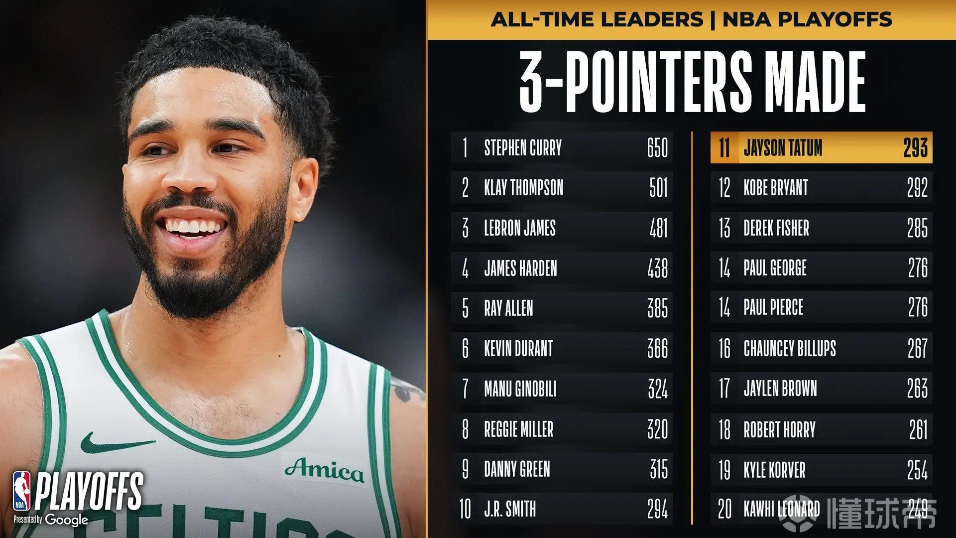 随着本场比赛结束,塔图姆的季后赛生涯三分总命中数已经成功超越湖人传奇科比-布莱恩特,升至NBA历史第11位。