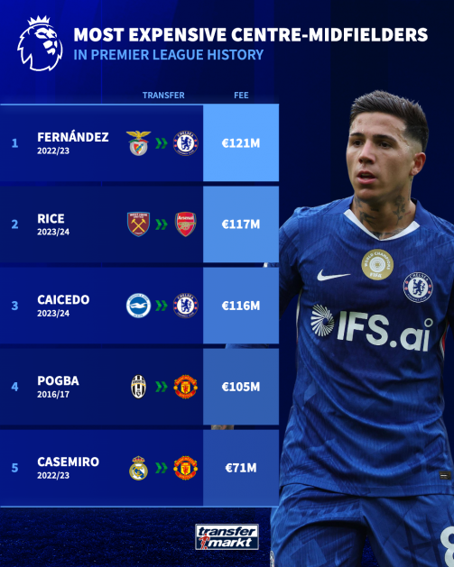 看看数据就知道,英超历史上转会费超过7500万欧元的中前卫,一共就四个。不过,那三笔过亿欧元的买卖全发生在最近四个赛季里。