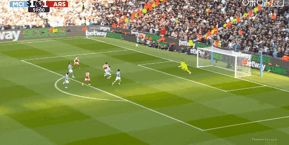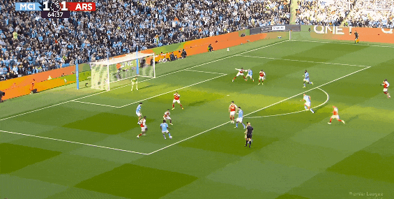 比赛第65分钟,哈兰德抢在倒地前打门帮助球队再下一城!曼城2比1阿森纳。